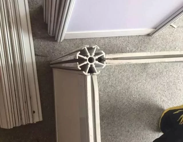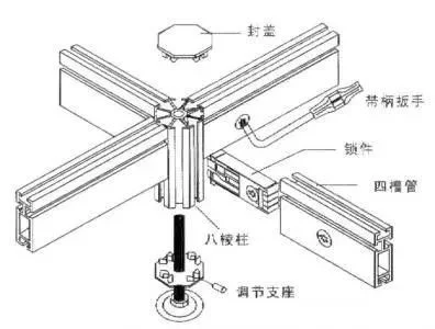 立杆的戴面呈八角形,八面均有开槽。它可以用配套的锁头从八个不同的方向固定展架。使用这种材料可以用有限的铝制杆件搭建出灵活多变、个性突出的展台。此外,它操作简单,只需拧紧锁头就可以相互连接,从而降低了安装的复杂程度,缩短了施工时间,因此被广泛应用于标准展台的搭建。