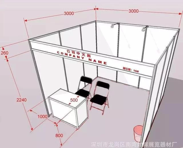 安装标准摊位时,采用国际通用标准而设计制作的展台,一般规为3.0m*3.0m*2.5m。